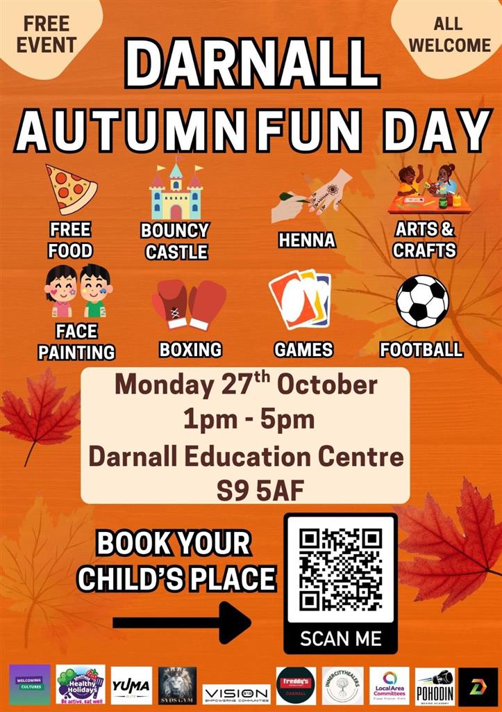 Join in the Darnall Autumn Day on Monday, 27th October at the Darnall Education Centre from 1-5 PM! π This is a fantastic opportunity for your little ones to enjoy a day filled with fun activities, games, and much more!