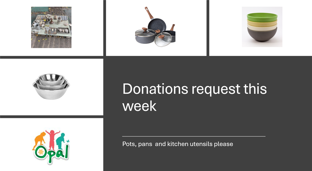 We’re excited to share that our children are having a blast during playtime, and the OPAL project is really taking off! This week, we’re on the lookout for any old pots, pans, and kitchen utensils you no longer use. If you've got any spare items lying around, we’d be absolutely thrilled to give them a new life in our play sessions!