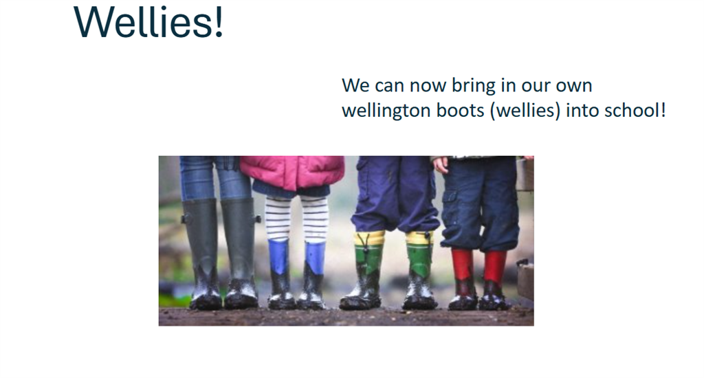 We’re excited to let you know that children can now bring in their own wellington boots (wellies) to school! This means your child will be able to enjoy outdoor play and learning on the field throughout the year, whatever the weather.