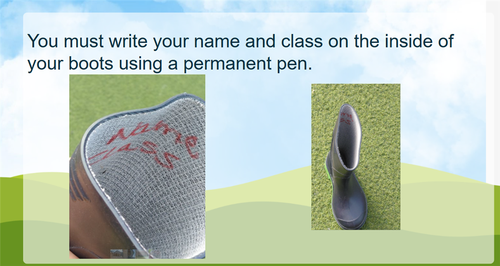 To help us keep things organised, please ensure that your child’s wellies are clearly labelled on the inside with their name and class using a permanent marker.
