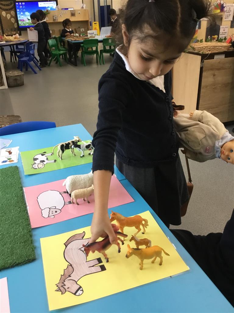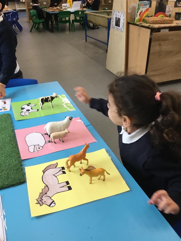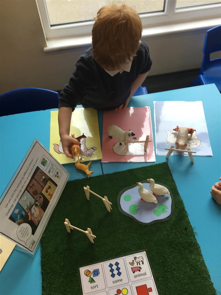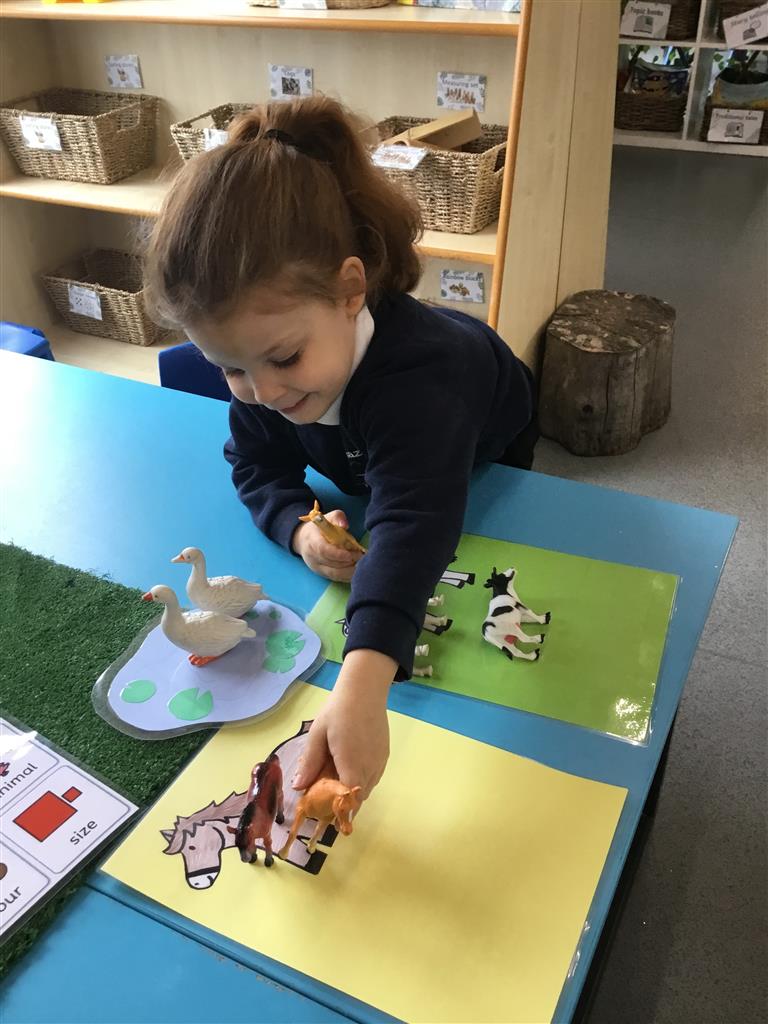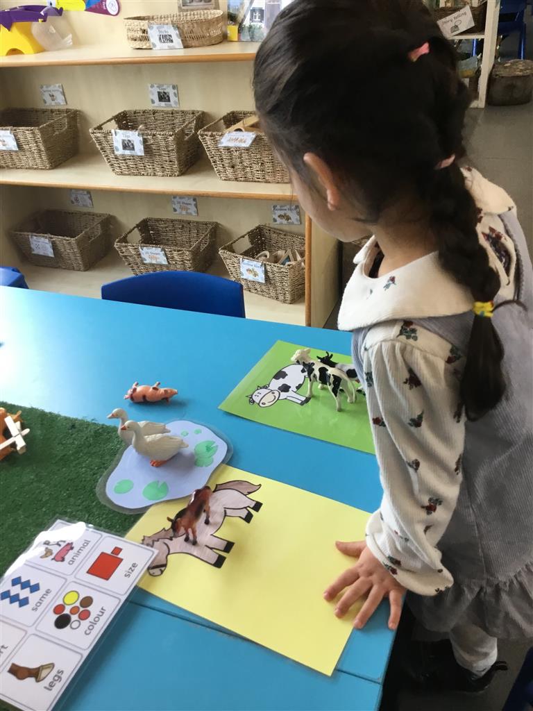 In nursery we explored different farm animals and grouped them by their type. The children looked closely at each animal, talked about what makes them the same or different, and placed them in the correct groups.