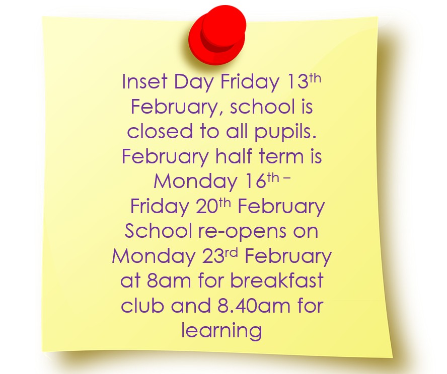 Just a little reminder that we have an inset day coming up on **Friday, 13th February**! School will be closed to all pupils 🎈