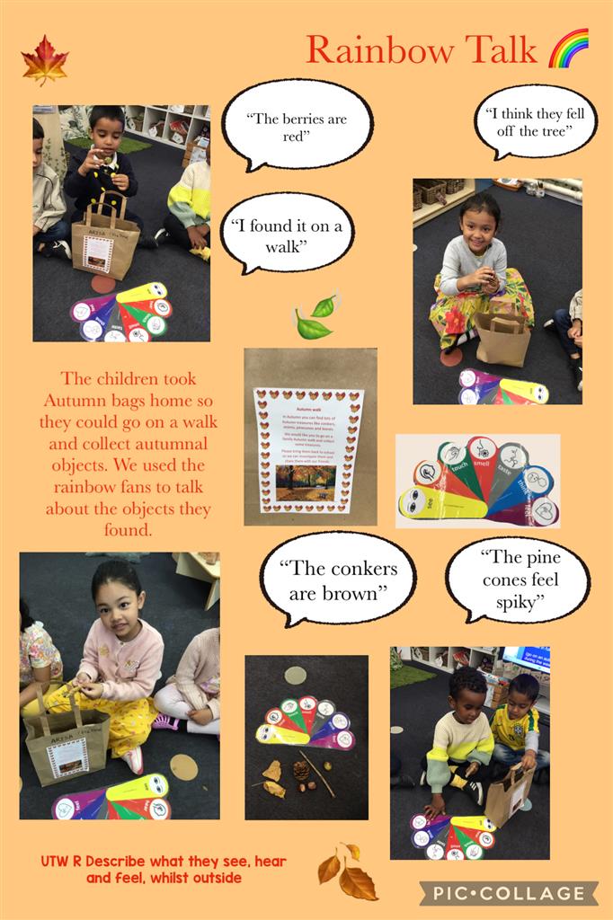 The children in FS2 took home autumn bags and went for a lovely walk to collect all sorts of autumn treasures. ๐โจ We had a blast using our rainbow fans to discuss the amazing things they found! ๐