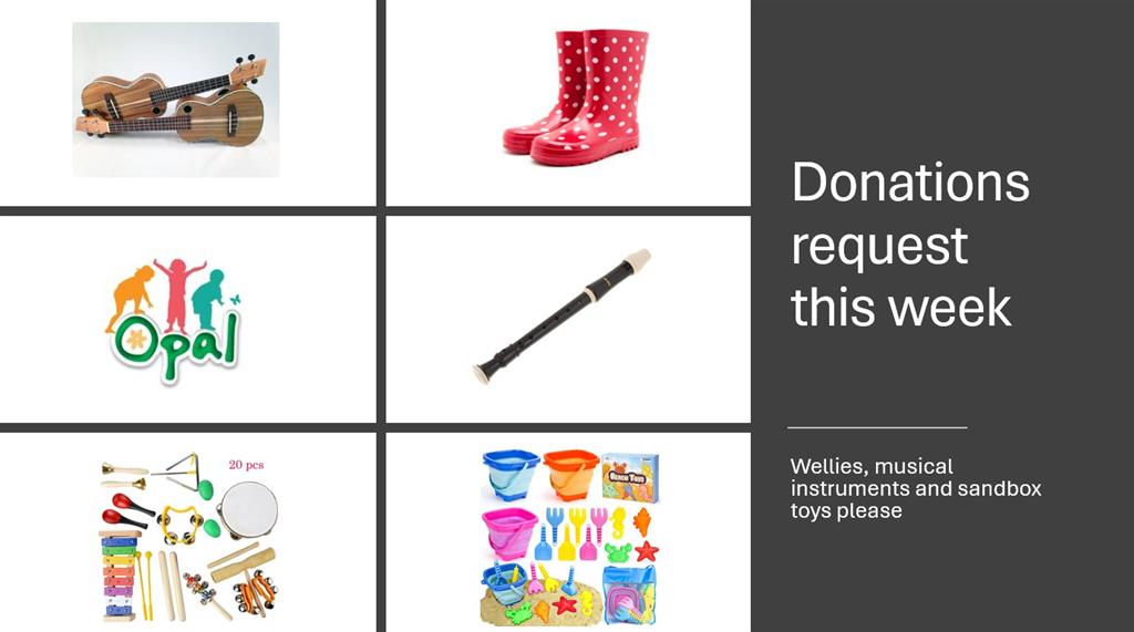 We’re excited to share that our children are having a blast during playtime, and the OPAL project is really taking off! This week, we’re on the lookout for any old musical instruments, wellies, and sandbox toys you no longer use. If you've got any spare items lying around, we’d be absolutely thrilled to give them a new life in our play sessions!
