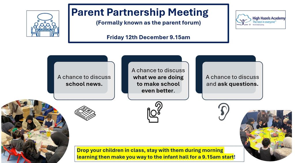 We are excited to invite you to our very first Parent Partnership Meeting (previously known as the Parent Forum) on **Friday, December 12th at 9:15 AM**! This is a fantastic opportunity for all parents to come together, chat about school updates, and learn about the exciting things we’re doing to make our school even better!
