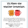 The Y5 team would like to invite Parents to a MEET THE TEACHERS BREAKFAST to give you the opportunity to share breakfast with your child and to chat with your child’s teachers.