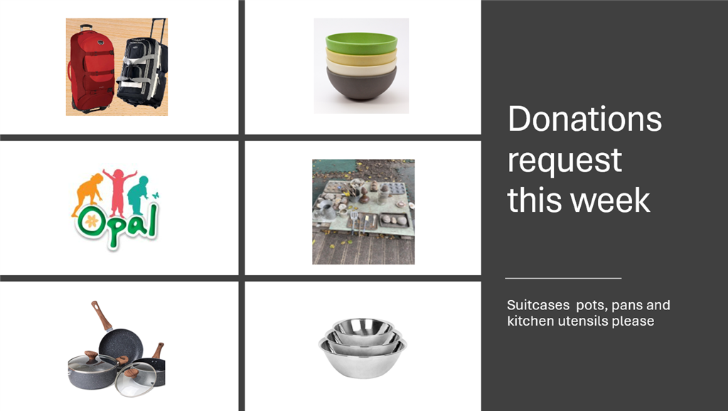 We’re excited to share that our children are having a blast during playtime, and the OPAL project is really taking off! This week, we’re on the lookout for any old pots, pans, suitcases and kitchen utensils you no longer use. If you've got any spare items lying around, we’d be absolutely thrilled to give them a new life in our play sessions!