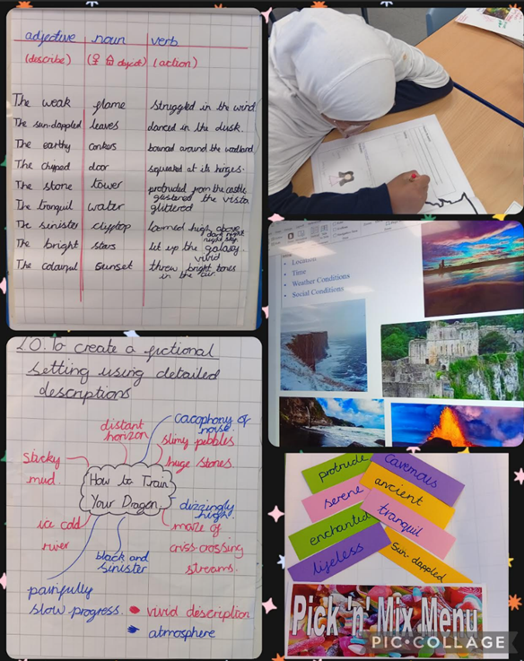 Students in Year 6 have been designing their settings for their fictional narrative. Working in groups, they annotated various settings and generated details descriptions including verbs, nouns and adjectives. The classes then collated some ideas and added them to their 'pick n' mix' wall which will support them through the remainder of the unit. What a lovely start to the week, Y6!